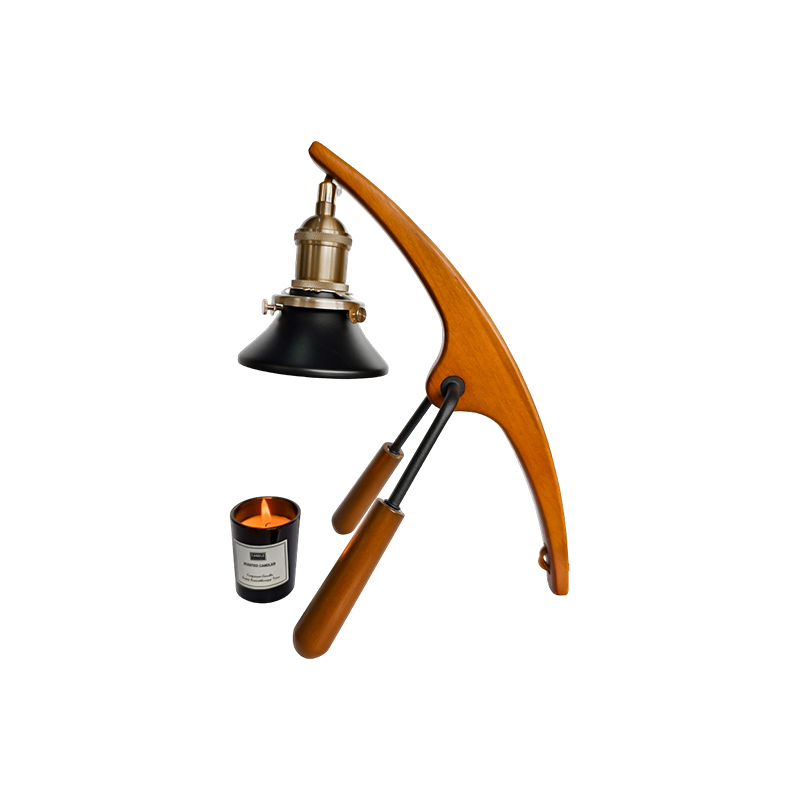 An elegant curved wooden arm holds a golden light, casting soft, graceful arcs of light and shadow.