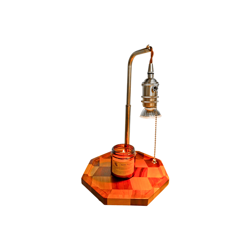 A retro lamp with brass and wood, where adjustable light creates a warm, flowing glow like a captured sunset.