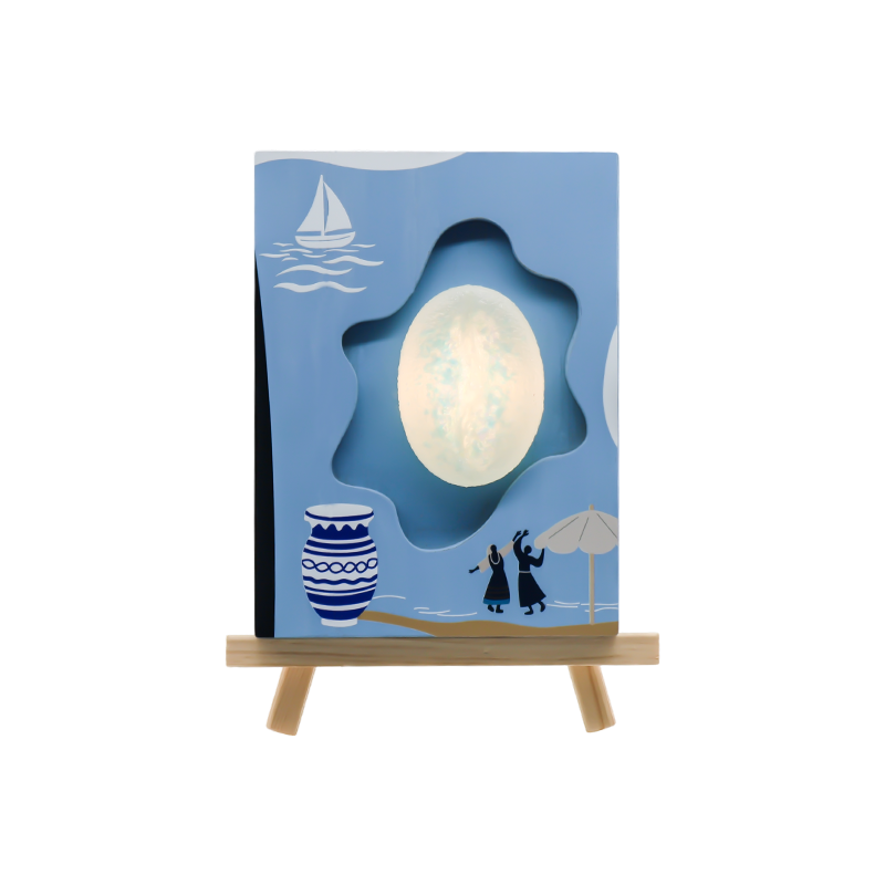 Framed by pale green wood, the lampshade gently embraces the sea and sky. The blue and white waves on the lampshade resemble the brushstrokes of a Ukiyo-e painting, their crests dotted with tiny glints of light, like tiny fishing lights. Warm light filtering through the hollows casts the shadow of a sail on the wall—a leisurely boat sailing far away, laden with the silver glow of moonlight and the whisper of the sea breeze. When the light comes on, the wood grain transforms into dancing silhouettes on the beach, and the sound of laughter beneath the parasols gently ripples out. The entire room becomes a seaside teahouse; no need to travel far; just sit quietly under the lamp and you can hear the rhythmic breathing of the tide. This light is the most gentle anchor on the night sea, allowing all drifting thoughts to anchor firmly in the harbor of dreams.